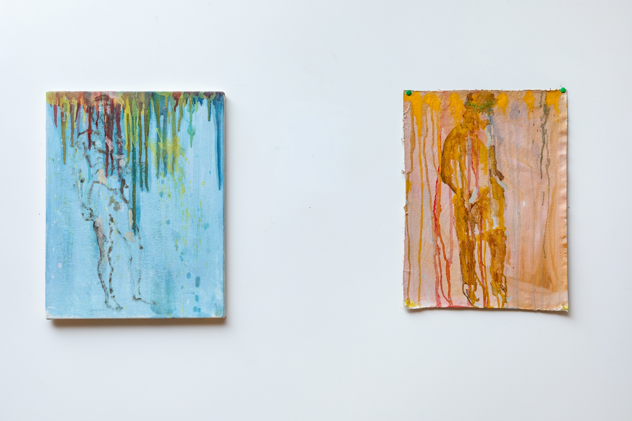 Fortemente intuitiva, la pittura di Mosca si addensa e si stratifica come nel caso dei Ritrovamenti, tre tele pensate come dei veri e propri rinvenimenti antichi, inventariati e catalogati, dove la composizione dei soggetti si risolve in un elogio alla storia della pittura stessa. Raggrumato e colante come in Drain off, a volte il tratto riporta la traccia di ricordi e memorie come in Complementari sporchi, dove la tela, come lascia intendere il titolo, viene sporcata con colori complementari: sette frammenti ritagliati da una tela più grande sono allestiti in successione, diversi i soggetti dipinti, alcuni sembrano autoritratti di Mosca altri dei paesaggi di Bergman. Il ricordo diventa ancor più evidente nelle pitture stemprate e diluite di Un giorno in barca, due tele dalla prospettiva fotografica, e in reflect, uno scorcio dallo studio dell’artista che si riflette sul fiume Tamigi realizzato durante il soggiorno a Londra nel 2012.