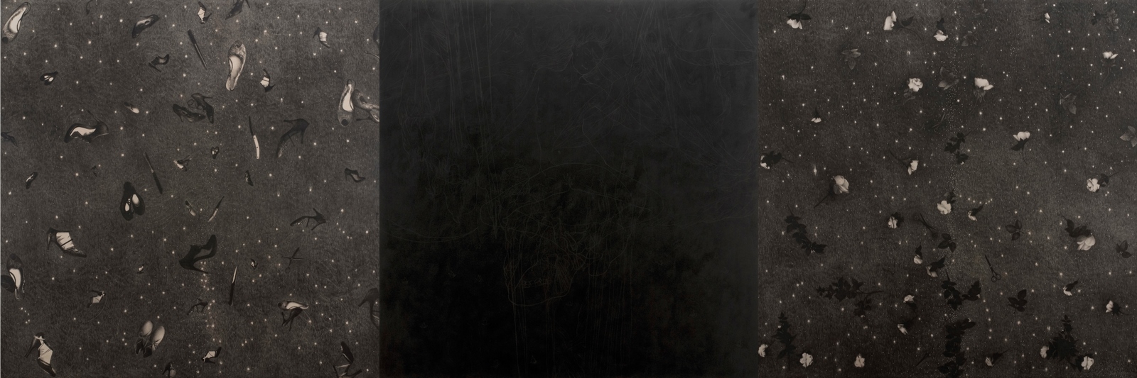 Un esempio è rappresentato dai carboncini su carta Perle (1991) che ricordano delle texture profondamente terrene dalle quali emerge un forte bagliore enigmatico, indice di quella che Eleonora Frattarolo definisce nel catalogo della mostra come «un’armonica tensione spirituale verso il sacro non assoggettata alla cura di un Dio e a un rapporto di fede religiosa».