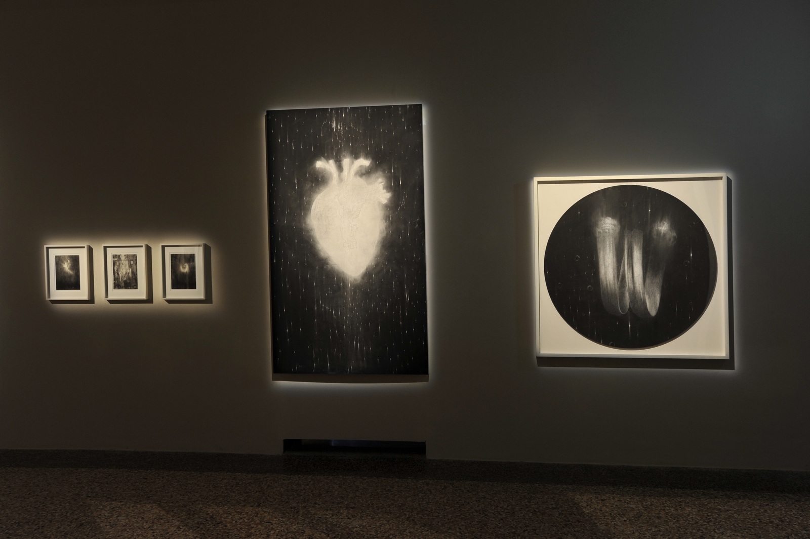 Il percorso prosegue con i disegni anatomici e monumentali. Passeggiando negli ambienti espositivi, le luci soffuse mettono in risalto le opere oscurando lo spazio circostante, e restituiscono una sensazione magica e avvolgente: dalle donne sensuali alle casse toraciche spoglie, dai teschi fino alle atmosfere oniriche. Il silenzio è percepibile nei piccoli luccichii di NGC/7419 (2021), che prende il suo nome dall’omonimo ammasso aperto nella costellazione del Cefeo, conosciuta per il gran numero di supergiganti rosse e per la sua caratteristica forma che ricorda quella di una matita. L’ispirazione per il disegno arriva da una serie di sogni fatti dall’artista, in cui figurava il numero 7419, a seguito della prematura scomparsa del figlio. Nella stessa stanza è installata Traiettorie dell’essere (1983), un gruppo di sei sculture che rimandano al concetto di pensiero, in cui l’uomo, con un arco incastrato nella testa, sembra in procinto di lanciare le proprie frecce.