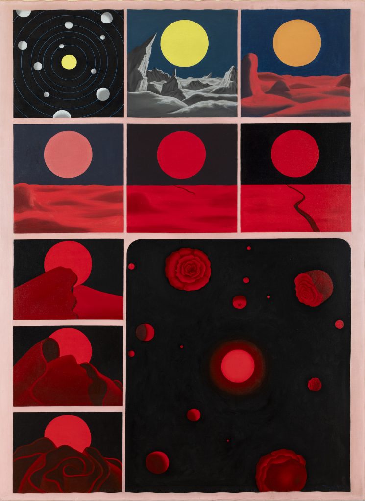 Interessante è la scelta di esporre nella prima sala anche delle riviste come “Casabella” e “Paesaggio casalingo” per cui Tateishi ha collaborato con la creazione di illustrazioni abbinate ai testi. Successivamente si trovano dipinti dove l’influenza dei manga è innegabile, Tateishi dipinge delle storie attraverso sequenze di immagini in cui l’atmosfera e il tempo sembrano essersi fermati, richiamando i quadri di Giorgio De Chirico.