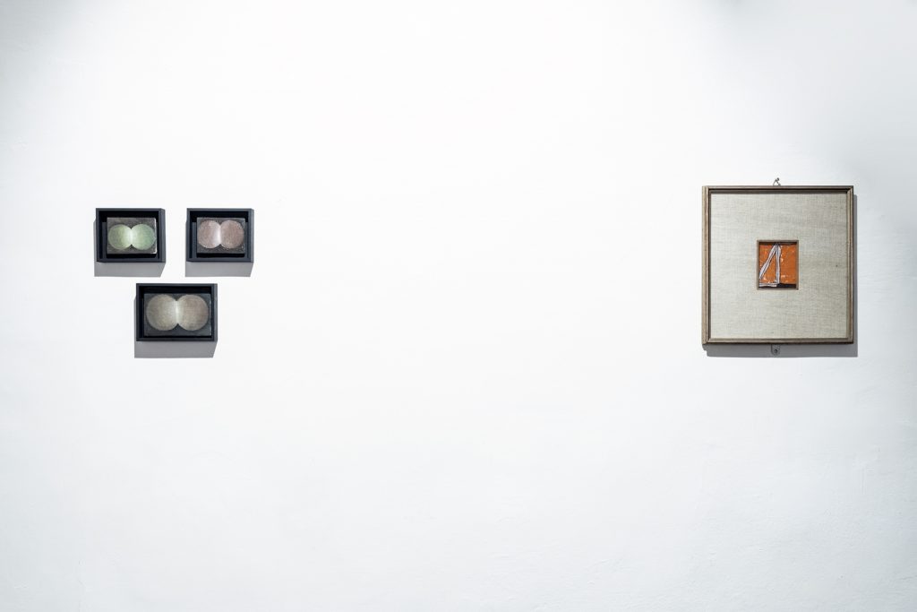 È evidente nelle tre grandi tele esposte nella prima sala – a precedere Lettone turchese – della serie Cotone contrario 1-2-3, dove nuvole di cotone sono posate a terra evocando immagini celesti, come anche nei tre piccoli dipinti intitolati Guardoni d’incanto e nei rovesci delle carte con le loro 58 o 72 geometrie, esposti nell’ultima sala in stretto dialogo con otto, altrettanto piccole, tele di Licini. «In Guardoni d’incanto l’immaginazione corre e quei cerchi ricordano il binocolo che vede due natiche allargate con al centro la luce. Poi ci sono 58 quadri e 72 quadri sono piccoli dipinti che rappresentano delle carte da gioco con all’interno il simbolo di quadri ripetuto 71 e 57 volte a formare un pattern. Al numero 58 e 72 si arriva aggiungendo ad ogni opera il quadro stesso che contiene i simboli. Insomma un gioco di parole, che trasforma la pura geometria in un ironico equilibrio tra astrazione e figurazione un tema caro a Licini», precisa Zechini.