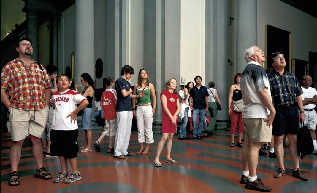 La mostra è lo stagno in cui non solo, come Narciso, si rispecchia l’artista, ma accanto a lui ci siamo anche noi visitatori, come negli specchi di Michelangelo Pistoletto o nella fotografia “Audience 1” di Thomas Struth, che immortala i visitatori alle Gallerie dell’Accademia di Firenze, che da osservanti diventano osservati. Lo stesso gioco al rovesciamento è presente negli scatti – imprevedibili – dell’installazione “Nikon Autofokusfalle” (trappola con autofocus) di Michael Schuster: l’obiettivo della macchina che, fissata su un treppiede, scatta immagini di chi visita la mostra in automatico, senza che possiamo sceglierlo, suona come una risposta beffarda all’iper-esposizione volontaria a cui ci sottoponiamo quotidianamente sulle piattaforme social, spazi performativi e di intrattenimento.