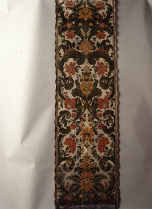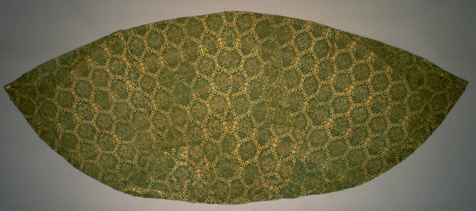 Tra i manufatti in esposizione nella Sala Tessuti di Palazzo Madama, anche due esemplari di velluti italiani operati, lavorati con filati d’oro e d’argento, i tessuti più richiesti da ogni corte del Rinascimento: un magnifico telo cremisi veneziano tagliato a due altezze, storicamente detto alto-basso, e un ampio frammento di velluto di seta rossa e oro, filato dal tipico disegno tardo quattrocentesco dei fiori di cardo, già parte di una veste liturgica.