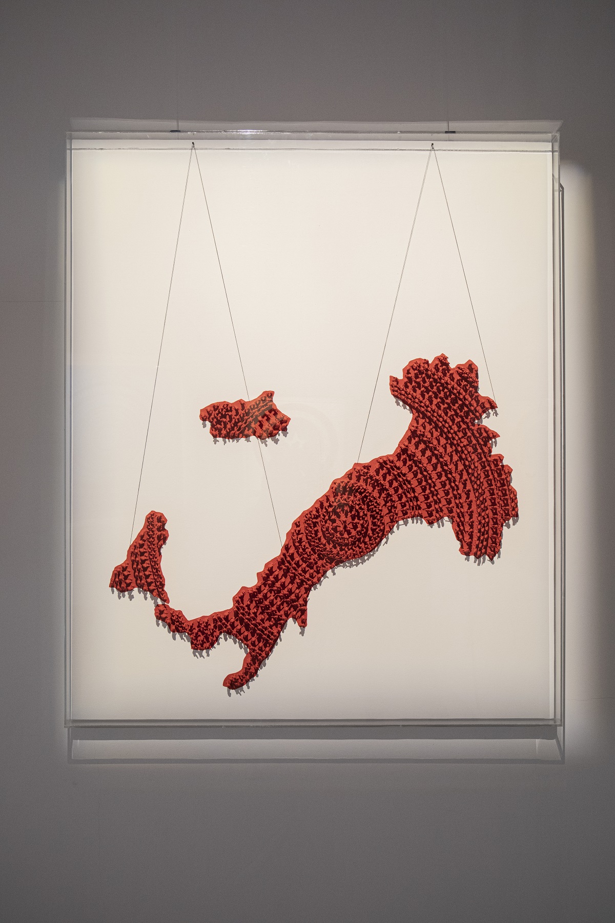 Paolo Ceribelli è uno degli artisti presenti nella mia collezione, come in tantissime altre in Italia e all’estero. Avrei esposto Paolo a prescindere perché le sue opere mi piacciono tantissimo, ma l’ho scelto come primo artista in relazione al periodo che stiamo vivendo. Ho selezionato le opere che realizza con i soldatini di plastica, forzando un pò la sua idea originaria sull’utilizzo di queste piccole figure “avendoci giocato da bambino sono rimasto subito colpito dalla forte contraddizione all’interno di questa piccola figura, questo mi ha spinto a riusarla per le mie opere d’arte” per giocare sui richiami che queste evocano: l’infanzia, il contributo che ognuno di noi esprime per lasciare una traccia nella Storia e nella sua storia, la coesione necessaria per vincere qualsiasi battaglia. Questo è il leitmotiv della mostra: la mappa del mondo con lo scudo di captain America, Mao, l’Italia appesa a dei fili ma in grado di sprigionare sempre la sua immortale bellezza, insieme con la confortante certezza espressa dai cerchi che Paolo da sempre ha intitolato “Tutto torna”.