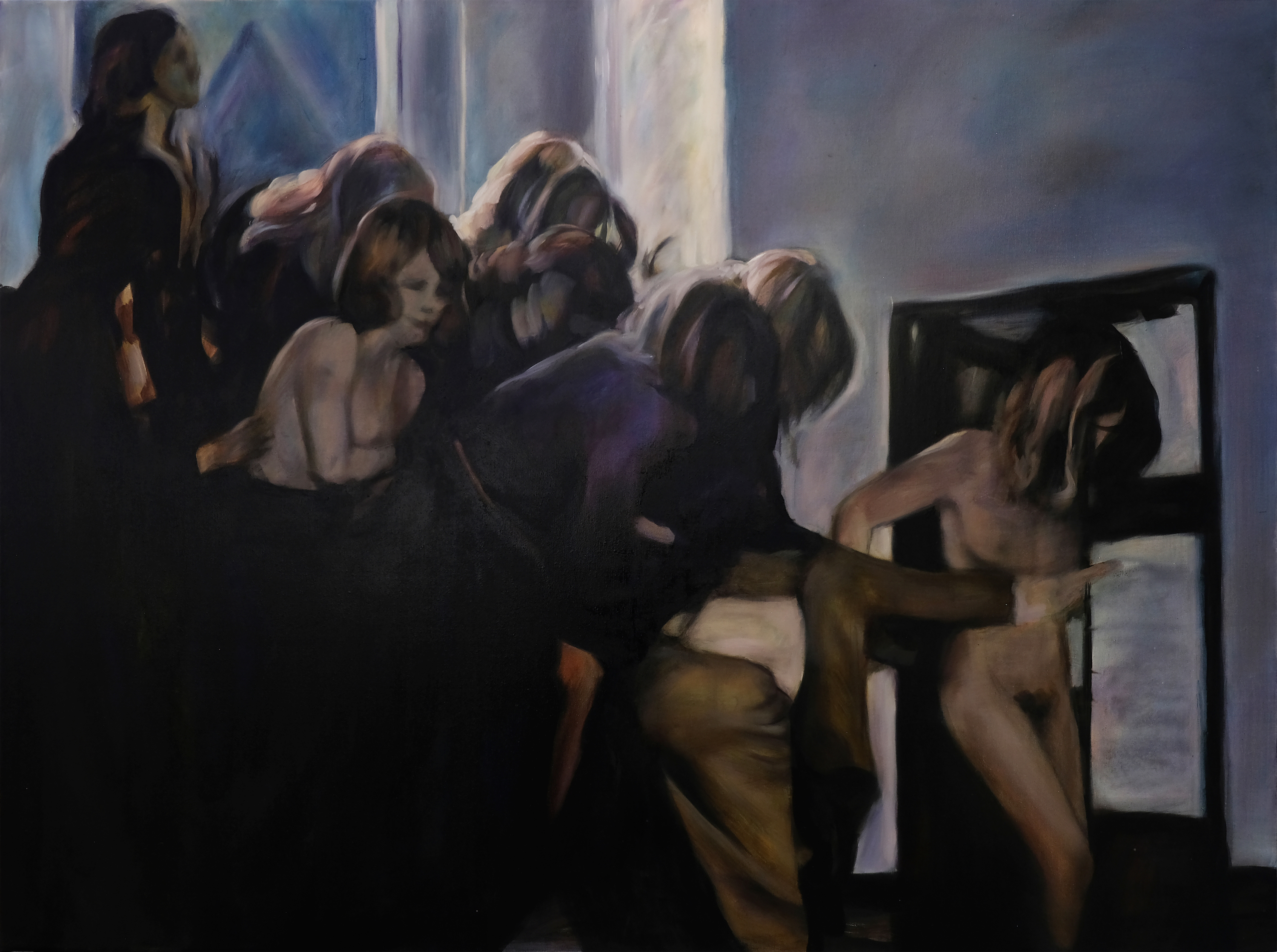 Iva Lulashi: «Espongo in questa occasione 12 dipinti inediti, realizzati nel corso del 2021, ispirati da un periodo di permanenza a Corniglia. La mia pittura ha avuto modo di confrontarsi con uno spazio e un contesto nuovo, in un dialogo con l’architettura settecentesca dell’Oratorio dei Disciplinati e con la sua semplice ma intatta dimensione spirituale, in un contatto ravvicinato con la vita che scorre intorno, fuori, nei vicoli (caruggi), nelle piazze e nella natura. Anche in questa mostra sovrappongo memorie passate e immaginari presenti ponendo al centro della mia riflessione la centralità del corpo e dell’erotismo privilegiando un punto di vista femminile. Nel contesto di una chiesa porto opere che si rapportano all’ambiente interno, immaginando una vita di personaggi femminili vestiti ugualmente di viola, che tormentate cercano una via verso la libertà ed il desiderio. Altri dipinti sempre situati in un ambiente chiuso (che potrebbe essere quello della chiesa) ci sono ragazze nude di spalle che studiano il dipinto che raffigura quello di una Santa, oppure semplicemente si studiano tra di loro, o ancora incontri fuggitivi. L’altra parte di dipinti invece rappresenta figure femminili che una volta all’aperto rincorrono i loro amori, attendono pallide nell’erba la persona chi le coglierà, si incontrano tra di loro per donare un piatto agli Dei, oppure consumano finalmente i propri piaceri».