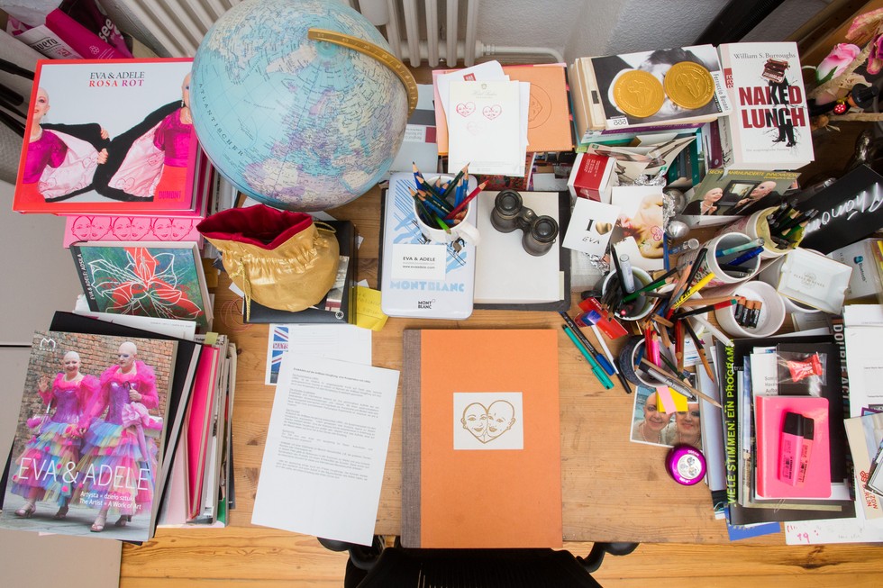 È una freddissima giornata dell’inverno berlinese, EVA & ADELE ci accolgono con un calore d’altri tempi nel loro appartamento-studio nel quartiere di Charlottenburg. Elegantissime in un vestito bianco e nero, ci accompagnano da una stanza all’altra, dove bon ton, ordine e precisione si uniscono ai colori sgargianti delle loro opere. Qui la parola d’ordine è “FUTURING”, il neologismo da loro creato all’insegna del quale da oltre trent’anni portano avanti una multiforme ricerca che ha come elemento fondante una performance che coincide con la loro vita, dagli aspetti più quotidiani ai gala nei grandi musei. EVA & ADELE non rivelano i loro nomi di battesimo, né il loro anno di nascita, preferiscono definirsi hermaphrodite twins from the future e ambasciatori del futuro giunti a Berlino con una macchina del tempo dopo la caduta del Muro. Loro “sono la loro performance” completamente fusa con la vita, che con essa coincide anche per durata, in cui operare artistico e esistenza personale non sono scindibili: realizzano assieme ogni opera, non si mostrano mai in pubblico l’una senza l’altra, né senza essere perfettamente truccate e abbigliate in modo identico anche nei dettagli e non rilasciano mai dichiarazioni che non siano espressione di entrambe. Tra gli esiti “tangibili” della loro ricerca ci sono anche numerose performance all’aperto con abiti appositamente realizzati, centinaia di dipinti, disegni, video e fotografie che insieme costituiscono un ricchissimo archivio.