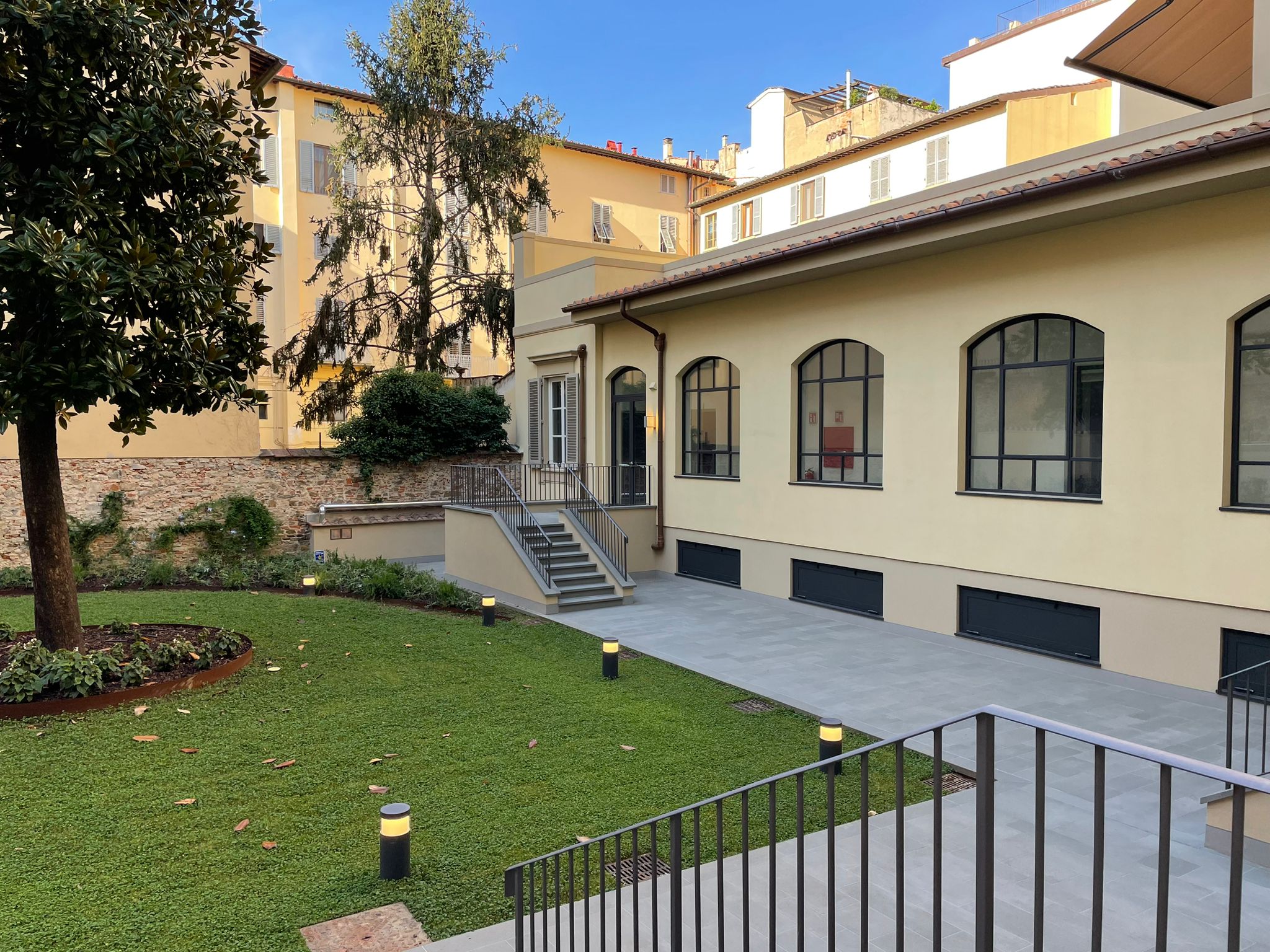 Anche il giardino interno è stato oggetto di lavori, tra sostenibilità e storia urbana. Al momento di piantumarlo, si è prestata attenzione alle specie di fiori, scelte non solo per la loro bellezza, ma anche per la loro capacità di sopravvivere con poca acqua e cura nei mesi estivi: begonie, perovskias, plumbago e covoni dorati, oltre a piccole siepi di alloro e un prato di dicondra. Al centro del giardino vi è un esemplare di magnolia, che si trovava in questo luogo già molto prima della costruzione degli edifici circostanti e che faceva parte degli ampi giardini del limitrofo ex convento di San Domenico del Maglio.