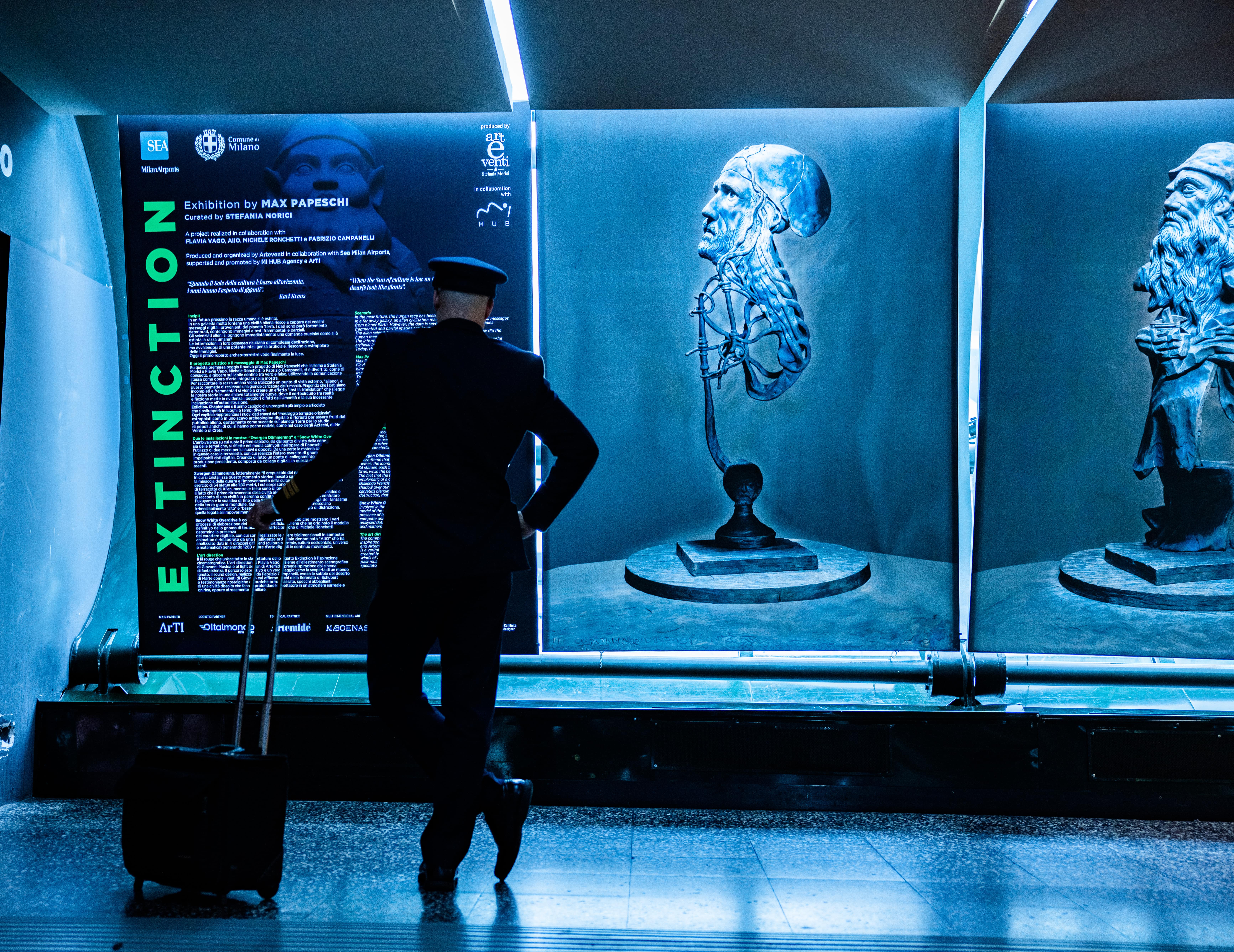 «La mostra istallazione Extinction rende più suggestivi gli ambienti del Terminal 1 di Malpensa – ha affermato Anna Scavuzzo, Vicesindaco di Milano – che tornano a ospitare esperienze artistiche di grande potere evocativo. L’aeroporto si trasforma in un luogo che permette una riflessione più ampia sui temi della contemporaneità, in cui non mancano conflitti e tensioni, e che allo stesso tempo ci restituiscono il bisogno di fermarsi a pensare, a meditare, a la-sciarsi provocare da una lettura della realtà che tenga insieme elementi fra loro contraddittori». Ha concluso Massimo Pozzi Chiesa, General Manager di MI HUB AGENCY che ha supportato il progetto: «L’arte, la sperimentazione di nuovi linguaggi e i new media sono tutti elementi caratterizzanti questo progetto e per questo abbiamo deciso di supportarlo e promuoverlo con MI HUB, nuova Officina Creativa che sviluppa percorsi strategici di comunicazione attraverso l’innovazione tecnologica e la contaminazione con forme di creatività differenti. Per noi è una grande sfida lavorare insieme a Max Papeschi e Stefania Morici a un progetto tanto ambizioso, quanto potente per il messaggio che vuole veicolare. Un banco di prova anche per MI HUB che ha nel suo DNA tutti questi valori».