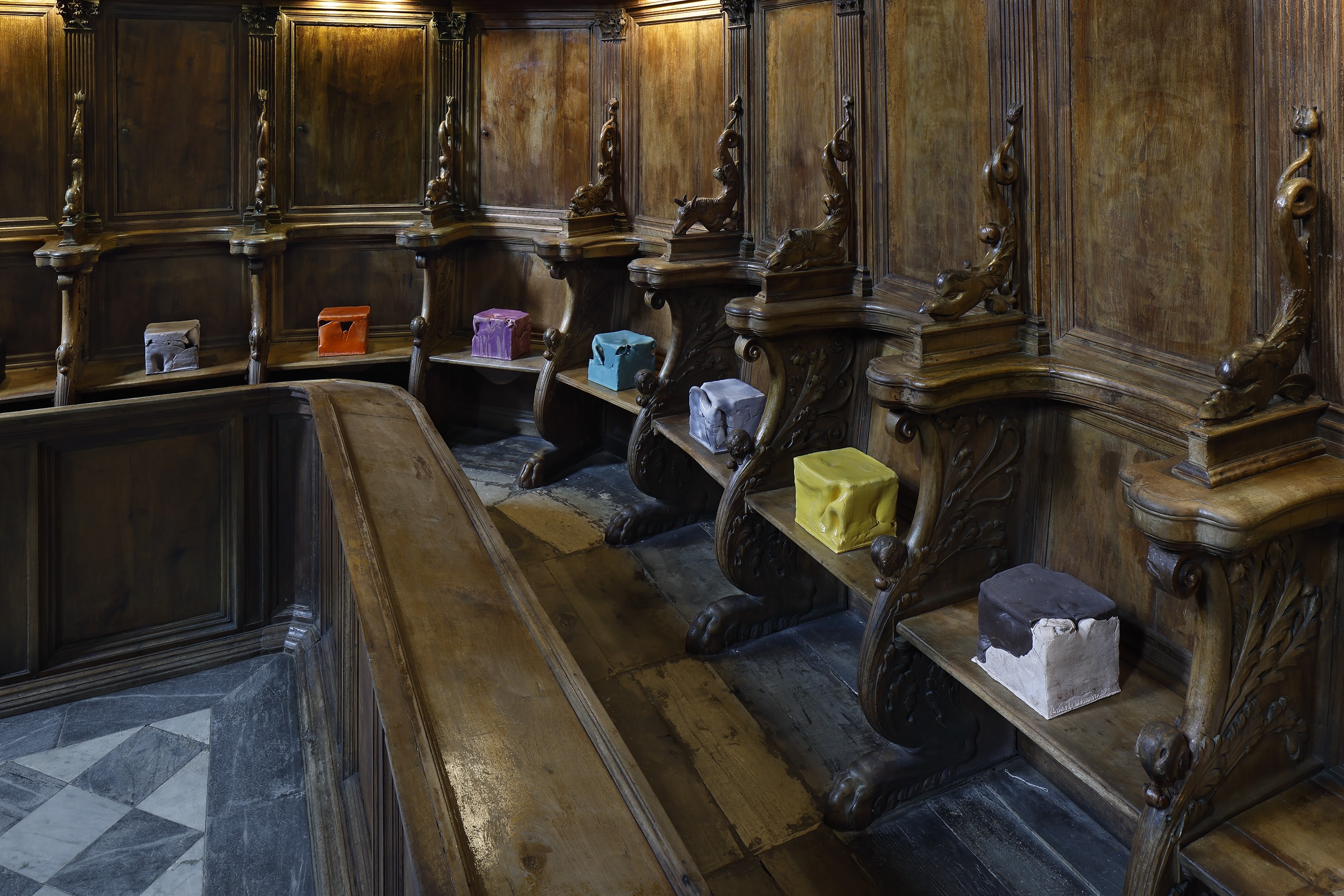 Le sculture in creta di Riccardo Monachesi si fanno strada in tutti gli ambienti della Certosa, sia esterni che interni, con una sensibilità mimetica e non intrusiva, votata alla serialità. Una triade di sagome amorfe si specchiano nel laghetto della Certosa, anticipando le conchiglie sospese – legate al pellegrinaggio e alla residenza dell’artista a Santiago del Cile nel 2015.