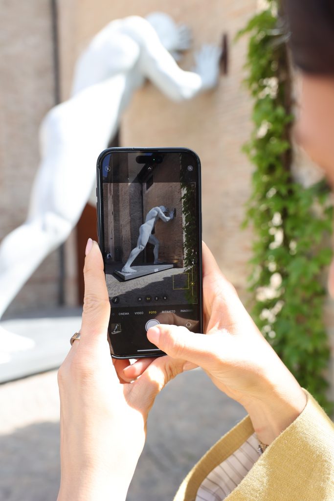 Giannelli è presente al festival anche con la sua personale Humanoid, curata da Camilla Mineo e ospitata nella chiesa sconsacrata di San Ludovico. Nella penombra di questo spazio, i giganti ibridi di Giannelli prendono in causa l’Uomo, sia nei suoi aspetti primitivi che in quelli futuristici. Ad accogliere il visitatore all’ingresso della chiesa è l’opera inedita Totem Tooth, che, come le quaranta opere all’interno, invita l’uomo a un ripensamento del proprio ruolo all’interno dell’universo e della società. All’interno, ci aspetta il quasi inevitabile scimmiottamento da parte del gruppo Monkey Tribù, critica all’omologazione e riflesso ironico del visitatore che è intento a scattare una foto. Gli uomini di Giannelli, dai visori che ricordano tanto quelli della realtà virtuale, ci fanno entrare in una realtà distorta, quasi apocalittica che ci spinge a riflettere sulla società contemporanea e su un’umanità resa ormai cieca e forse non più tanto umana.