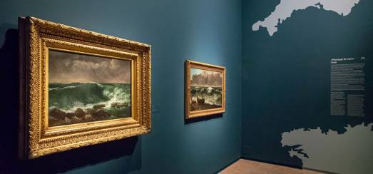 E dire che il mare, come soggetto dei suoi lavori, lo scoprirà solo nel 1841, sulla costa normanna. Per lui “orizzonte infinito che non incontra elementi terrestri”, il paesaggio marino occuperà soltanto la seconda parte della sua vita, per diventare talmente predominante che Courbet sarà indicato, ancora in vita, come il pittore delle onde, scegliendo Etretat come punto di vista privilegiato perché li la spiaggia sassosa e la costa più scoscesa favoriscono un mare agitato. Quel mare in tempesta di cui, grazie a Courbet, non vediamo soltanto il prorompere impetuoso delle onde ma ne sentiamo l’urlo, il moto vorticoso o il fragore mentre sbatte contro gli scogli.