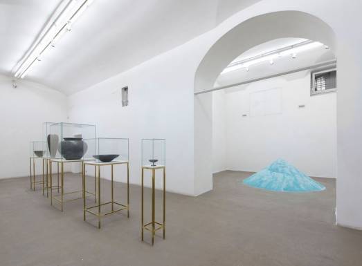 La realtà come paradosso e l’assenza come cifra distintiva usata per creare dei cortocircuiti percettivi sono gli assiomi fondanti della pratica artistica della Kwade che in iPhone, Lampe, Computer, Kaminhur e Küchenuhr propone una versione insolita e spiazzante di questi cinque oggetti comuni: un iPhone, una lampada, un computer, un orologio da scrivania e un orologio da cucina. Ad un primo sguardo questi vasi dalle fattezze classiche elegantemente presentati in teche di vetro come fossero dei reperti archeologici sono il risultato della manipolazione radicale di quegli oggetti che polverizzati e amalgamati con delle resine hanno dato vita a dei nuovi oggetti. Nulla si crea e nulla si distrugge come ci ha insegnato la fisica ma, certamente, tutto si può trasformare dato che la materia è fluida ed è sempre in divenire in base al suo collocamento in un determinato spazio e momento. La misurazione del tempo trascorso in una dimensione materiale tangibile è al centro del lavoro 1518 leere Liter bis zum Anfang (2008/2018) un cumulo piramidale di vetro polverizzato di un colore celeste intenso che è quello delle bottiglie di acqua Selters. L’artista ha raccolto tutti i vuoti delle bottiglie d’acqua consumate dai membri del team della Galleria König di Berlino in un anno che poi sono stati polverizzati da una ditta specializzata. Un anno di molte vite umane concretizzato in una piramide di vetro, una sorta di vissuto materiale, un attraente sudario per rappresentare l’inesorabile scorrere del tempo, e in particolare del tempo vissuto materialmente. Il mondo parallelo che Alicja Kwade mette in scena in questa mostra densa di suggestioni estetiche e intellettuali è un continuo gioco di rimandi ottici e di sgambetti percettivi che ci sorprendono e ci spiazzano opera dopo opera, insegnandoci non solo l’esercizio del dubbio ma, soprattutto, il desiderio di esplorare quel labile confine fra visibile e invisibile che permea di mistero tutto il suo lavoro.