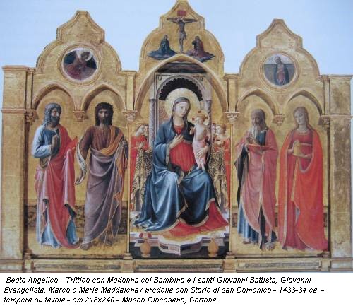A Roma, infatti, Angelico lavora in due occasioni, per gli affreschi della cappella del Sacramento di Eugenio IV nel ’45 e successivamente per la Niccolina, ma lascia opere anche in Santa Maria sopra Minerva, come la Madonna con Bambino (una tempera su tela, perché destinata al trasporto in processione), proveniente dall’altare della cappella Frangipane, che Gerardo De Simone confronta con il Tabernacolo dei Linaioli per la monumentalità e la posa analoga del Bambino in piedi.