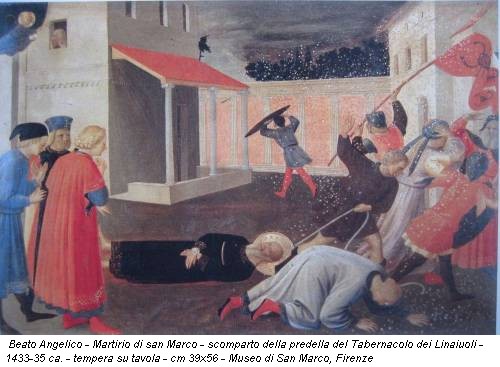 Effetti atmosferici, straordinari e oggi divertenti si vedono nel Miracolo del corpo di San Marco, dal tabernacolo dei Linaioli del ’33, dov’è dipinta una tempesta di grandine e neve, a suo modo ancor più realistica di quella celebre di Masolino nel Polittico della Neve, anteriore di qualche anno, per la romana Santa Maria Maggiore.