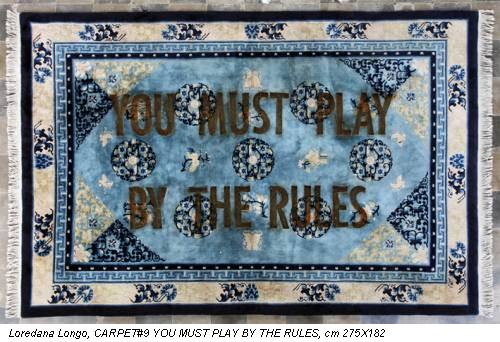 Sulla superficie dei tappeti ‘culminano’ concetti verbali, frasi di senso compiuto che Loredana Longo ha attinto dai media, dalla vulgata e incise col fuoco, carattere dopo carattere, come una sorta di tatuaggio indelebile.