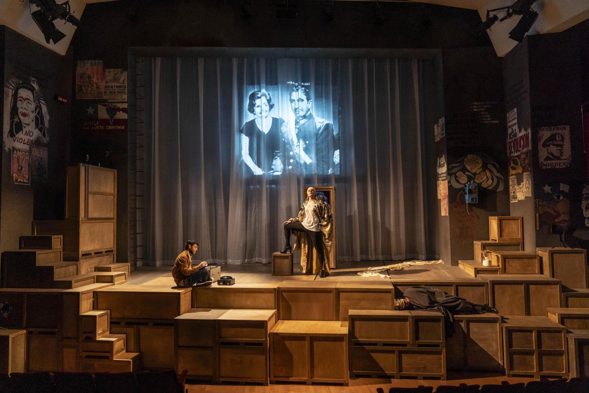 La ricca scenografia (di Guia Buzzi) di manifesti d’epoca, di slogan politici sulla revolución e di colorati murales che ricoprono parti della scena e delle pareti del Teatro Grassi, oltre a casse di legno di varie dimensioni che dalla platea formano gradini fin sul palco, ci introduce in un interno domestico arredato di oggetti e mobilio vintage fortemente kitsch. A ricreare l’immaginario pop di un Sudamerica e altri luoghi esterni all’appartamento, che ambientano e modulano la vicenda, è anche una parete frontale di alluminio ondulato e una passerella in alto, che si aprono e chiudono come un otturatore fotografico. L’arredamento casalingo è completato da altre casse accumulate dallo studente-militante e dai suoi compagni – che vanno e vengono nella casa -, il cui interno, spacciato per libri, in realtà contiene armi destinate per l’attentato – poi fallito – a Pinochet.