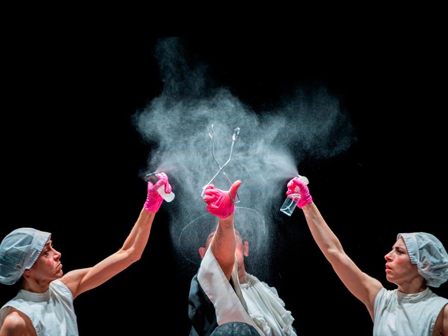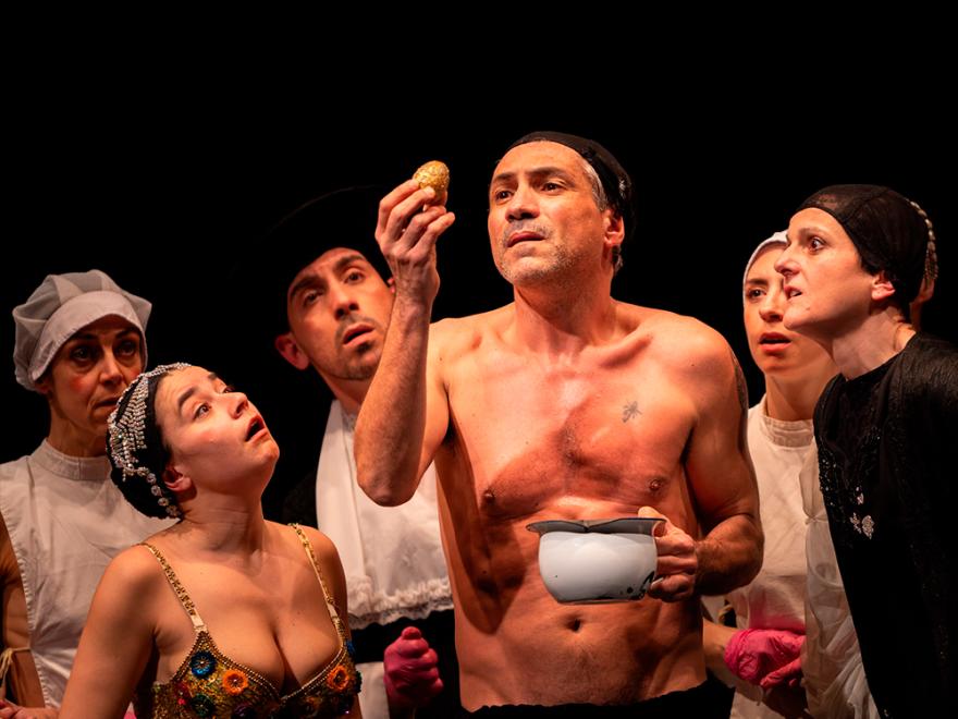 Su brani musicali di Händel (la celebre aria Lascia ch’io pianga), e del compositore Stefano Landi (una Passacaglia salmodiata in versione barocca), tutto è affidato ai corpi degli attori, alla loro dissacratoria e funambolica fisicità che attinge anche alla Commedia dell’Arte. Si susseguono scene di avidità, ingordigia e ingozzamenti – di spaghetti, che ricordano Miseria e nobiltà; di pasticcini divorati e sputati, come in mPalermu, spettacolo rivelatore della regista siciliana; di vertiginosi e buffi balli circolari tra calici e fette di mortadella; di bizzarri rituali aristocratici tra alterchi e insulti; di dispute sul primato della cucina napoletana o francese.