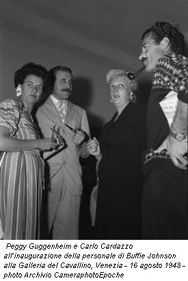 Torniamo indietro di qualche anno. Nel 1946 Carlo Cardazzo conosce Peggy Guggenheim; con lei, oltre all’amore per le avanguardie artistiche, in particolare per il Surrealismo, e la promozione dell’arte americana, condivide una buona dose di “coraggio” e “intuizione”, doti che hanno consentito a entrambi la scoperta di nuovi talenti. Grazie a Cardazzo, Peggy scopre artisti come Giuseppe Santomaso, Vinicio Vianello e Tancredi Parmeggiani (che seguirà con la stessa forza e ostinazione prodigata nella divulgazione dell’arte di Pollock); grazie a Peggy, Cardazzo conosce Cy Twombly, Jackson Pollock, al quale nel 1950, al Naviglio, dedicherà una grande mostra personale. Nel 1956 è ancora Carlo Cardazzo che pubblica la prima autobiografia di Peggy Guggenheim uscita in Europa: Una collezionista ricorda, a suggello di un sodalizio di stima, collaborazione e percorso comune, anche se in autonomia, come ricorda Barbero in un saggio a catalogo.