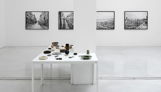 Le fotografie di Lynn Davis ci restituiscono uno stato di fatto che non esiste più: le piramidi d’Egitto prima dell’invasione del turismo di massa o le rovine di Palmira prima dell’Isis. Senso del tempo e memoria dei luoghi in una serie di stampe ai sali d’argento. Immancabile, Gabriele Basilico con il suo reportage a Beirut (1991): una città martoriata da 15 anni di guerra, i resti di un decadimento che non è dovuto al lento e inesorabile passare del tempo, all’azione dei secoli sui manufatti, ma a un’azione indiscriminata e spietata la cui ferita si può udire nel silenzio metafisico che l’assenza di qualsiasi presenza umana produce. Dal silenzio degli scatti di Basilico ai fiumi di parole di Kushari II, parte di un complesso progetto filmico di Saverio Pesapane sulla storia egiziana che ci restituisce le testimonianze di chi ha vissuto la rivoluzione e le elezioni presidenziali tra il 2011 e il 2013 nella valle del Nilo. Di silenzio però si potrebbe parlare anche in questo caso: il silenzio dell’Occidente, che assiste, osserva da lontano, filtra le notizie, circondando il dramma di quei luoghi con un’impenetrabile cortina di insensibilità, proprio come ci raccontano le opere della serie Play for me again, di Mauro Ghiglione. I tragici eventi di quelle terre dimenticate in Occidente vengono consumati solo attraverso le immagini, derealizzati dagli schermi tv, rapidamente skippati e dimenticati; Saddam, il mondo arabo, i prigionieri occidentali di una guerra quanto mai incomprensibile e ingiusta, fruiti come fossero una qualsiasi finzione scenica. Nelle opere di Ghiglione la bidimensionalità delle fotografie in bianco e nero si contrappone all’evidenza di oggetti aggettanti: nel passaggio dalla virtualità dell’immagine alla corporeità degli oggetti quei fatti diverranno forse reali, palpabili, degni di attenzione. Evidenza concreta anche per Tarek Zaki, che con History of O, dà vita a una vera e propria “archeologia del presente”: i suoi manufatti, tutti di forma circolare, appaiono come rinvenimenti da scavo ma sono in realtà oggetti di uso quotidiano appartenenti al mondo contemporaneo. I “resti futuri” di Zaki dialogano per affinità concettuale e visiva con i reperti di Massimo Gatti nella serie fotografica In superficie. Si tratta dell’inventariazione estetizzante di oggetti rinvenuti durante le campagne di scavo in Iraq alle quali Giatti ha partecipato. Insieme a vasi e cocci millenari però si mescolano proiettili e bombe a mano, depositatisi nel terreno durante le guerre recenti ed entrate impropriamente e pericolosamente nella stratigrafia.