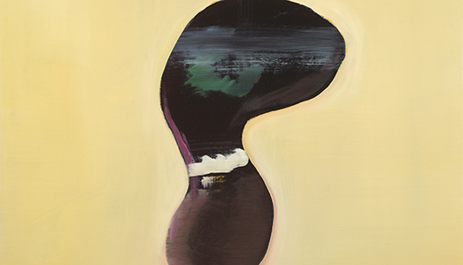 La felice comunione che si respira in questo piccolo ambiente si arresta nelle tonalità decisamente più cupe della seconda ed ultima stanza. Come già preannunciato dall’ipnotica visione del germano reale si entra in un luogo pittorico dominato dal blu di Prussia che colora quattro delle cinque opere esposte: al centro della parete principale Lion Cavern, un enorme leone stilizzato che se ne sta appollaiato e ci osserva come un avvoltoio; insieme quattro piccole tele che tracciano il solitario percorso di una carpa, un palinsesto di riferimenti letterari e di esperienze negative dell’artista. Apparentemente lontani tra loro, questi cinque lavori si fondono nel comun denominatore del blu, il quale accorre a disegnare un fondale marino, una riva o un abisso, lasciando aperta ogni soluzione interpretativa.