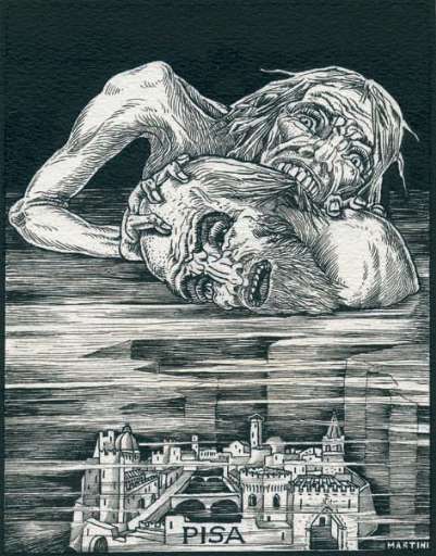 Nel 1901 partecipa al concorso per l’edizione illustrata della Divina Commedia promosso dagli Alinari e lo vince assieme ad altri artisti come La Pella, Zardo. In mostra ci sono le splendide tavole dedicate a Caronte, Pier delle Vigne, Brunetto Latini, accomunate da uno spiccato intento narrativo, che progressivamente verrà abbandonato nell’edizione del ’22, interamente illustrata da Martini. Qui si apprezza un segno più aereo ed evanescente, come nell’illustrazione di Beatrice. Ma un ulteriore salto avviene nell’edizione del ’37, dove il segno si fa più grafico, sintetico, e la citazione dantesca non è più parte del disegno, ma semplice didascalia, come in Pepè Satan e nel Conte Ugolino.