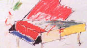 Il supporto degli spartiti fa nascere strumenti musicali dai cromatismi intensi e infantili: chitarre e pianoforti sospesi come sonanti totem di una memoria e di una poesia colorata che vagabonda sul confine tra pittura e musica.