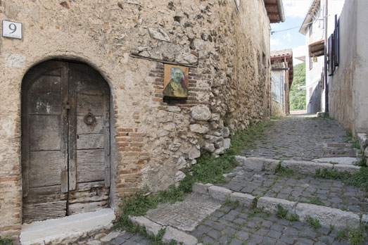 Prima di entrare all’interno di altre strutture, il percorso da seguire è quello spigoloso segnato dagli angoli delle case e l’attraversamento è ricco di sorprese e opere che si inseriscono senza sospetto nelle trame delle pareti di roccia delle abitazioni, nelle crepe e negli scorci laterali. A partire da una caratteristica presenza musiva sulla facciata di una casa che riporta il ritratto della signora anziana proprietaria dell’immobile, la Fondazione Malutta ha inserito in varie nicchie del borgo una serie di dipinti raffiguranti donne dai volti scarni e segnati dal tempo, cogliendo nella senilità la dimensione tipica di questi luoghi isolati, ormai abitati da una popolazione anziana e, in parte, disabitati per quasi tutto l’anno.