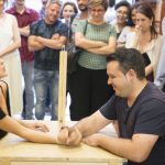 Il rapporto con il passato si fa presente, e il presente vive di memoria che si fa attualità: questo sembrano testimoniare gli oscuri personaggi e i dettagli delle inquadrature pittoriche delle tele di Dario Carratta esposte a Palazzo Maccafani. Se in questi luoghi si entra in contatto con una parte della storia passata del borgo, negli spazi del Bar si abbraccia il ritmo della vita quotidiana che anima Pereto nella sua dimensione di paesino che ancora resiste (se solo si pensa alla miriade di paesini abruzzesi abbandonati, disabitati, sventrati dal terremoto). E questa “resistenza” è stata colta da Elena Bellantoni con una performance coinvolgente condotta dall’artista nel bar, centro gravitazionale del borgo, con il linguaggio della sfida e del gioco “braccio di ferro” al cospetto degli abitanti del luogo, congedati dopo la prova di forza con la domanda “Cosa resiste?”…tra le risposte anche “Pereto” . E noi aggiungiamo l’arte, l’arte resiste.