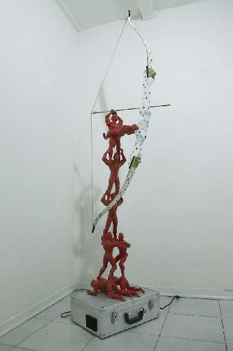 Le Trappole seducenti di Gabriele Silvi conducono invece in un’atmosfera all’apparenza più ludica. Gli oggetti sono posti nello spazio dando allo spettatore il desiderio di girarci attorno e di interagire con essi. The dillinger escape plan è un flipper col quale è possibile intrattenersi come accadeva da ragazzi al bar durante le vacanze; XIIX Twin Tower è una scatola di montaggio: seguendo le istruzioni è possibile ottenere il modellino dei famosi grattacieli newyorkesi; Pericolo Scampato è un arco con freccia sostenuto da una complessa struttura plastica. Quello che però pare evidente è il senso di pericolo e l’impossibilità della fuga. Osservando i lavori, notiamo che il bersaglio della freccia siamo noi stessi, mentre una voce avverte del pericolo che stiamo correndo, il flipper traccia un percorso, che è una via di fuga in mezzo a sparatorie, ma seguendo le frecce si torna al punto di partenza e alla fine in buca, e le torri gemelle sono pericolosamente in bilico. Attirando lo spettatore con l’esca del gioco, Silvi conduce in uno spazio mentale dove le regole sono invertite e i punti di riferimento della nostra società sono crollati. L’uomo si ritrova libero da miti, ideali e valori che condizionano menti e azioni, dalla razza alla religione, alla nazione.