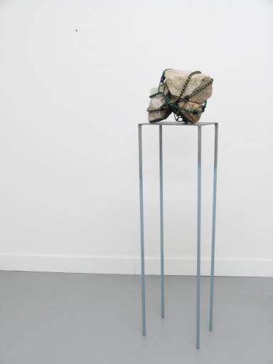 Tra le opere scultoree, che si contrappongono al flusso di immagini, Basamento (2013) è concepita su un labile piedistallo sul quale sono appoggiate antiche pietre vulcaniche trattenute da cinghie elastiche che rafforzano la percezione di un’instabilità compressa.