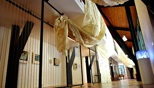 Grande conoscitore dell’arte della carta, Nobushige Akiyama strappa questo materiale ad ogni funzione pratica, e lo trascina nel dominio della scultura. Le sue sculture – che attraversano, in un ipotetico dialogo tra carta giapponese e carta italiana, i suggestivi ambienti del Museo della Carta di Toscolano Maderno sul Lago di Garda – trasmutano in forma l’anima della carta, ovvero le sue caratteristiche fisiche più intime e essenziali. E così la consistenza evanescente, morbida, impura della carta kozo viene esaltata in una sorta di lenzuolo che incombe sui rulli della macchina continua – l’antico macchinario per fabbricare la carta – apparendo quasi vivo, come uno strato gigante di epidermide; mentre le caratteristiche delle fibre sono utilizzate dall’artista per creare una superficie irsuta e ruvida nei volti in altorilievo di Cinque sensi, fissati su tessuto colorato di indaco secondo la tecnica giapponese del siborizome.