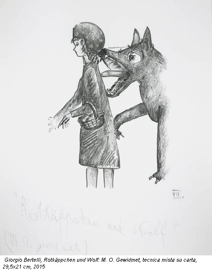 Dalle tavole a grafite della giovane illustratrice polacca Joanna Concejo che hanno ispirato il tema dell’esposizione, allo splendido lavoro di Lorenzo Mattotti in cui i protagonisti si incontrano in una fitta foresta di segni a china, all’ironia di Fausto Gilberti nelle cui illustrazioni la bambina diventa frontman di una rockband bestiale, allo spirito dissacrante di Franco Matticchio che in mostra presenta due lavori pensati per l’occasione insieme ad alcune tavole a fumetto che svelano “La vera storia di Cappuccetto Rosso”, quella vietata ai minori di 18 anni, e ancora alle immagini fresche e delicate della bresciana Elena Tognoli e di Alessandro Gottardo, fino agli acquerelli di Giorgio Maria Griffa in cui la piccola si confronta con un lupo feroce modellato tra segni diluiti e colature nere che ricordano le macchie di Rorschach.