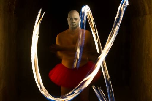 Nucleo dell’esposizione è una video proiezione che, oltre ad avere ispirato il titolo della mostra, documenta un’azione densa di sacralità e di tensione emotiva. In queste immagini lo stesso artista, con il volto imbiancato e con addosso un tutù rosso, diventa un personaggio a metà fra il grottesco e il mitologico, quasi fosse uno sciamano che si destreggia con “catene di fuoco” disegnando linee infuocate nella penombra del cupo e profondo corridoio in cui l’azione si svolge. Questo video accoglie il visitatore nella prima sala e lo prepara ad una seconda video-proiezione allestita nella cripta sottostante dove il volto bianco dell’artista appare in primo piano e viene continuamente attraversato dalle scie luminose che ne trasfigurano l’espressione trasformandolo, ad ogni passaggio, in altro da sé.