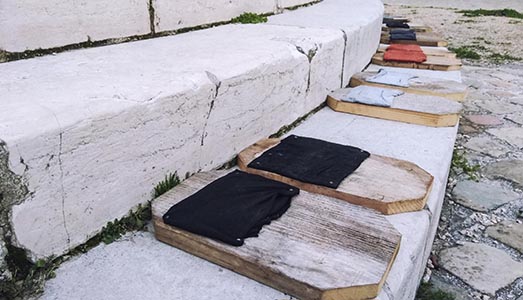 Nella corte della Mole Vanvitelliana di Ancona riecheggia il suono di legno che batte sulla pietra; è il rumore provocato dai visitatori che stanno momentaneamente attivando un’opera in mostra. Si tratta de Il Quarto Strato di Sonia Andresano, installazione site specific pensata per la Salina di Margherita di Savoia, composta da diverse paia di grandi sandali che l’artista ha realizzato assemblando legno e tessuti reperiti sul territorio. Sandali che ora si muovono e schioccano sui gradini del tempietto di San Rocco al centro della corte. Ma come sono giunti fin qui? La risposta è semplice: è attualmente esposta presso le sale del Museo Omero (che ha sede negli spazi della Mole) la mostra bipersonale degli artisti vincitori del premio Apulia Land Art Festival: Sonia Andresano e Francesco Romanelli. Un ex-equo che mette a confronto due ricerche e due approcci diversi che, proprio come in un tandem, si sostengono e risultano complementari. Ma il tandem, come ricordano i curatori Giosuè Prezioso e Giuseppe Capparelli, evoca anche la necessità dell’arte di creare relazioni e innescare scambi tra opera e osservatore, cosa che nel contesto in cui ci troviamo è ancor più evidente proprio per la vocazione stessa del Museo Omero, che da sempre si spende nel sostenere un’arte accessibile a tutti, con particolare attenzione ai non vedenti.