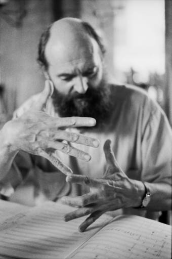 Alla Galleria Studio La Città è esposta una mostra collettiva di artisti che rende omaggio, direttamente e indirettamente, alle opere del compositore estone Arvo Pärt. Lo spazio espositivo ha permesso la suddivisione dei lavori in tre gruppi: video, fotografie di Roberto Masotti (Ravenna, 1947) dedicate all’artista, e installazioni. All’ingresso due fotografie ai sali d’argento sono appese al muro a indicare il messaggio di cui già il titolo è portatore: alla luce. In ognuna di esse, infatti, è rappresentato un calice, simbolo cristiano che rimanda alla massima “Per crucem ad lucem”, cioè attraverso le sofferenze della croce si può arrivare alla luce, alla salvezza. Questa luce si manifesta attraverso la musica minimale di Pärt che chiama in causa pochi elementi per creare un’armonia semplice ma profonda, come lo sono le opere esposte in galleria. L’omaggio di Masotti al compositore è frutto di una attenta analisi della vita e dei gesti di Pärt, impressi su pellicola ai sali d’argento. Sono indagati gli sguardi, i movimenti, le assonanze e le discordanze con il mondo che lo circonda, ogni volta interpretando con maestria e sensibilità i caratteri di una nuova poetica musicale. In primo piano abbiamo più volte le mani, strumento di lavoro dell’artista compositore che non solamente scrive, ma suona il pianoforte. In questi lavori degli anni ’90 e 2000 la volontà di lettura in bianco e nero focalizza l’attenzione sui particolari e rende l’immagine armonica in parallelo agli spartiti, per natura bi color. Il risultato si mostra come una moltitudine di finestre aperte in un’altra dimensione poetica in cui Pärt appare assorto, concentrato, attento perfezionatore di un’arte immateriale, emotiva e sensoriale.