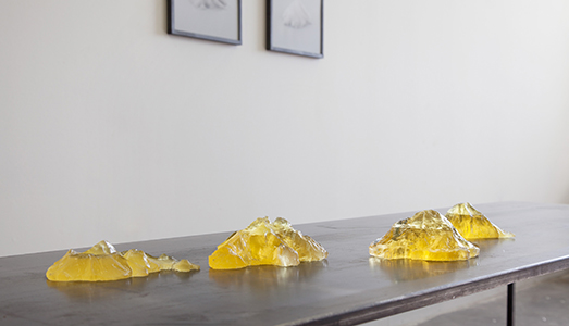 L’indagine di Paola Pasquaretta si incentra sulla riflessione dell’agire artistico. I modelli scelti sono dei vulcani riprodotti (tramite studi in loco) in blocchi di piccole dimensioni con un materiale effimero come il sapone. Questi sei originali calchi in miniatura (Etna, Vulcano, Lipari, Panarea, Stromboli, Vesuvio, 2014) hanno una caratteristica comune ai modelli “originali”: la trasformazione nel tempo attraverso inevitabili cambiamenti di stato. In pochi giorni sono già visibili erosioni sulle cime e sulle superfici laterali, sovvertendo così il leitmotiv della scultura come immagine solida, ferma e inalterabile nel tempo. Mentre il carattere di permanenza è demandato dall’artista a due fotografie che ritraggono una copia dei crateri eseguita questa volta con la schiuma del sapone (Vulcano 01, Vulcano 02, 2014), modellata e poi “congelata” nello scatto fotografico. L’immagine che ne è derivata permarrà integra nel tempo, al contrario del soggetto reale che in pochi istanti è svanito.
