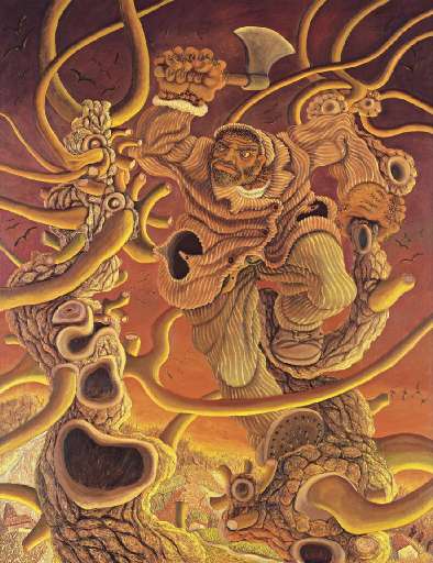 Nel periodo in cui lavorò come bidello in una scuola, infatti, Covili ebbe modo di studiare le opere dei grandi artisti classici e soprattutto degli esponenti dell’arte a lui contemporanea: riconoscibile l’influenza di Van Gogh, specie nelle figure maschili dei tanti contadini all’opera. Queste figure diventano anch’esse simboli della fatica e della sofferenza dell’uomo: Il potatore che avanza brandendo la sua ascia, non lotta solo contro i rami degli alberi, ma contro tutte le forze avverse della natura; L’urlo del contadino è un grido di disperazione cosmica. Le immagini sono permeate di umana partecipazione e allo stesso tempo di un forte simbolismo, che si risolve spesso nella deformazione delle fattezze dei personaggi.