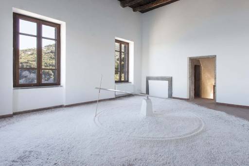 Salendo la stretta rampa di scale che porta al primo piano, si sente il fruscio del Vento del sud, opera di Albanese. Un video, proiettato su un tavolino, mostra centinaia di fogli, impilati per formare una casa di carta, che si agitano, dispersi dal vento e ritrovati sul pavimento reale della sala, ricoperto dalle pagine accartocciate. La riflessione sul movimento ritorna in Cosa ferma le altalene?, installazione composta da cinque giostre magnetiche, sospese su altrettante lastre cosparse di limatura di ferro. L’oscillazione del magnete disegna percorsi astratti nella polvere e genera la forza d’attrito dinamico che porta alla stasi. Un crepitio attrae verso l’ambiente adiacente. Qui, un grande compasso, in bilico orizzontale come un’altalena basculante, disegna un cerchio, imprimendo la sua geometria perfetta su una distesa di sale. È Mare chiuso, prima di una serie di opere sul tema della migrazione. Il meccanismo segue un ritmo programmato e guida una penna dorata sulla grande pagina bianca di cristalli salini, merce di scambio per eccellenza e sineddoche del viaggio.