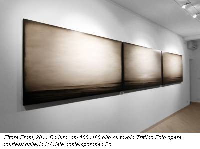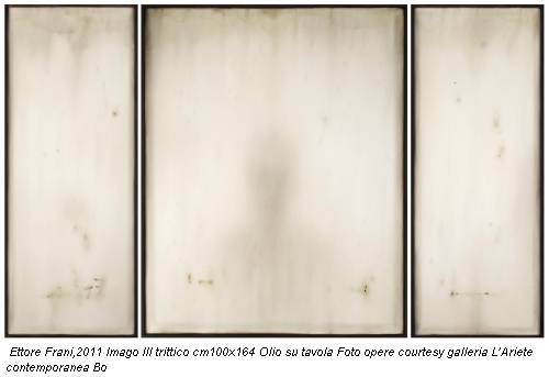 Così tra questa immensità s’annega il pensier mio: E’ un verso, che avrebbe potuto scrivere Ettore Frani (Termoli 1978, vive e lavora a Roma ) poeta, che si esprime col pennello, che pone una domanda all’essenza. La sua, potrebbe essere definita una pittura del silenzio. Della riflessione. Perché, stare di fronte alle sue opere, è lasciarsi coinvolgere da una visione inaspettata, è porsi un interrogativo, magari lo stesso che si è posto l’autore. Cosa c’è al di là del visibile? Un pensiero che ci sorprende, avvolti nella dimensione di quiete che il suo lavoro riflette, fra nebbie bianche, ombre grigie e sapienti stratificazioni che ci separano dall’invisibile. Ed ecco i lembi di colore, passato e ripassato, la tavolozza dei grigi, le sfumature illimitate, l’alone di una presenza, dove tutto sembra lontano, in un hinc et nunc che si può toccare. E la grande capacità tecnica di un pittore, che elabora sapientemente la sua poetica e costruisce con pazienza il suo lavoro.