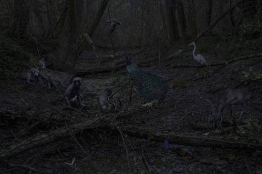 Chiaramente ispirata all’iconografia tradizionale è la grande stampa fotografica “Bosco con animali esotici”; una rivisitazione dell’omonimo arazzo fiammingo del XVI secolo custodito proprio presso la Galleria Nazionale delle Marche. L’operazione accoglie qui una sottile vena ludica e gli animali, fotografati separatamente, vengono trattati come singole sagome; pezzi di un puzzle da comporre a proprio piacimento all’interno di uno scenario boschivo.
