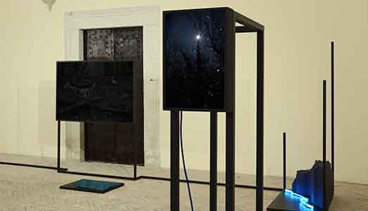 La grande installazione site specific “Tre notturni”, che riprende il titolo del componimento chopiniano, è definita da una struttura tridimensionale in ferro nero; linea disegnata nello spazio che circoscrive un paesaggio naturale misterioso e ricco di simboli. Un racconto a più livelli in cui l’artista ci accompagna assemblando in un’unica narrazione formati e medium differenti. Il piccolo light box , le immagini fotografiche  e le sculture a terra sono tenute magistralmente insieme da un elegante equilibrio cromatico in cui la notte, con i suoi colori, è protagonista assoluta e punto di partenza di una ricerca sulla luce e le ombre che la Mariotti affronta da tempo.