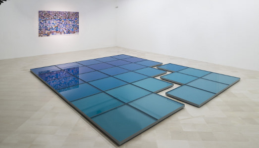 Da un lato una delle opere esemplari di Pascali, un mare modulare, realizzato nel 1967 alla vigilia della sua prematura morte. ‹‹Le prossime cose che voglio fare sono delle cose di acqua… l’acqua mi affascina molto, diventa come uno specchio, ha tante cose l’acqua››, rivelò Pino a Carla Lonzi (nel suo libro Autoritratto). E così concepisce quel mare dal sapore minimale, anzi di un “minimalismo mediterraneo”, come più volte l’ha definito il critico d’arte Pietro Marino, decano dell’arte contemporanea pugliese, che nel 1990 portò l’opera pascaliana al castello Svevo di Bari per Il luogo e la contrada, una significativa ricognizione sulla natura made in Puglia vista con lo sguardo degli artisti contemporanei.