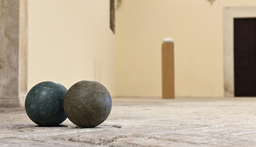 Si tratta del quarto appuntamento della serie di mostre curate da Riccardo Bandini. Un percorso in sei tappe che vede protagonisti giovani artisti legati al territorio marchigiano, chiamati a relazionarsi con questo imponente contesto tramite un progetto site specific. La tematica scelta dal curatore per l’intero ciclo è quella del viaggio e il titolo, “La conquista dello spazio”, la presenta in maniera non scontata; tuttavia, nell’era di internet e dell’iper mobilità globale, in che modo è ancora possibile trattare questo tema? Strappato sceglie di ri-partire dal paesaggio, soggetto ricorrente nella sua poetica e, allo stesso tempo, tributo alla storia dell’arte classica racchiusa e custodita all’interno della Pinacoteca del palazzo Ducale Urbinate. Omaggio che determina anche la scelta di ideare una mostra scultorea in senso tradizionale, lasciando fuori dal progetto espositivo, anche se solo apparentemente, la tecnologia che spesso caratterizza i suoi lavori. Si tratta, infatti, di un’uscita di scena che investe la sola fase di formalizzazione dell’opera; il processo resta indissolubilmente legato al mezzo digitale attraverso il quale l’artista capta, raccoglie ed interpreta, come antichi messaggi in bottiglia, quei frammenti di fatti di cronaca (spesso cruenti) che diverranno la principale suggestione per le opere in questione. Un progetto espositivo in cui il viaggio è simboleggiato anche dal continuo spostamento tra la dimensione informatica digitale e quella reale. Un doppio ed un dualismo che ritroviamo anche nell’opera “Untitled (this world, other worlds)” , due bocce sintetiche di uguale dimensione, ma differente colore, poggiate a terra.