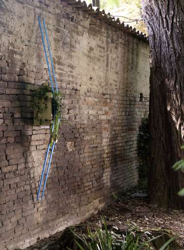 Francesco Carone invece, in linea con la sua poetica, ha circondato il tronco di un albero gigantesco con un anello quadrato costruito con più di mille metri gialli (Hortus conclusus, 2007): un’installazione dal sapore fortemente metafisico, la sensazione netta di un’epifania, una macchia assurdamente geometrica che spunta all’improvviso nel verde rigoglioso. Sempre nel giardino, da segnalare l’opera di Nicola Toffolini (Crescita prestata, 2007), forse la migliore in mostra: un’edera soffocata da una morsa di legno, e trattenuta contro il muro da due raffinati elastici celesti, sta crescendo nella costrizione e nella tortura. Come un bonsai postmoderno.
