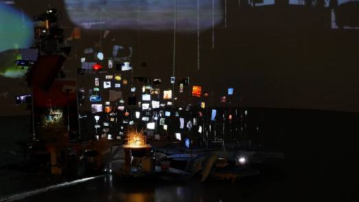 L’approccio è Barocco, circolare, quasi voluttuoso e in questo flusso di immagini costante e apparentemente caotico, l’occhio del visitatore è stimolato da punti di vista differenti come nell’incessante balenare delle immagini che compaiono e si sovrappongono nella nostra mente e nella nostra esperienza quotidiana della realtà fisica. Al contrario dell’idea vitruviana dell’Uomo al centro di tutto, nel lavoro di Sarah la presenza umana è sempre fuori squadra, come se fosse non in equilibrio, in qualche modo l’uomo quindi non è più misura di tutte le cose ma quasi cosa essa stessa in questo continuo fluire di brandelli di immagini di vita vissuta o solo semplicemente rubata dal quel grande data base che è internet. Nelle nostre vite di esseri umani di questo XXI secolo fatto di immagini, siamo ormai assuefatti o forse semplicemente anestetizzati dall’invasione quotidiana di immagini che, come in una centrifuga visiva, sottopone la nostra retina e la nostra mente all’altalena incessante di un perpetuo high and low, proprio come nelle installazioni di Sarah Sze, così affascinanti e contemporanee proprio perché prive di una narrazione coerente e in cui tutto è in perenne movimento e trasformazione.
