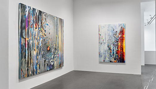 La luce, in questa sua affascinante opera site-specific, è stata anche materializzata dall’artista attraverso una serie di macchie di colore, tipo action painting, sul pavimento della galleria, un modo per creare un trait-d’union fra la grande scultura che occupa il centro della galleria e i dipinti che accolgono il visitatore all’entrata dello spazio espositivo. Sarah Sze dice di se stessa che ha la pittura nel cuore e questa pratica rappresenta, infatti, la parte più intima e meditativa del suo lavoro. Le sue recenti opere pittoriche sono molto materiche, quasi tridimensionali, il suo è un approccio alla pittura decisamente scultoreo, con una misurata sovrabbondanza di particolari oggettuali e di segni nonostante la parte del leone sia quella affidata alle spesse mani di pittura che inglobano, carta, stampe, oggetti e inchiostro in modo da adattare la particolare sensibilità e unicità del suo linguaggio scultoreo alla bidimensionalità della tela. Nel mese di Novembre, nei suggestivi spazi archeologici della Crypta Balbi di Roma, l’artista ha installato la sua prima scultura da esterno, un grande masso di pietra diviso a metà come un geode.