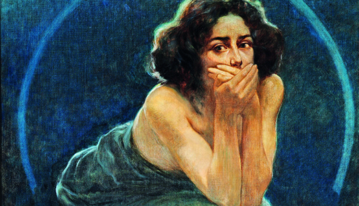 Quasi intimiditi come davanti a un luogo sacro, avanziamo a tentoni prima di addentrarci in penombra nel tempio di Palazzo Roverella. All’ingresso, dove l’ordine imposto è un religioso silenzio, a zittirci letteralmente non sono le guardie o i custodi dell’edificio storico bensì quadri, oggetti e sculture con labbra serrate da dita, che nel linguaggio esoterico corrispondono al gesto arpocratico, messo già in risalto dalla scultura di Fix-Masseau o Bigot, ma che troviamo ovunque nelle sale rodigine per la mostra “Arte e Magia. Il fascino dell’esoterismo in Europa”. In una esposizione con un vasto apparato di prestiti (molti dall’estero soprattutto Parigi, Bruxelles, Londra, Praga, e da collezioni private e romane) che parla di enigmi e stregoneria, conciliaboli alchemici in mezzo a rappresentazioni di riti massonici o d’iniziazione, come potevano mancare le ‘opere al nero’ di Odilon Redon e forme ancestrali come quelle realizzate da Itten e Balla? O le tenebrose scene di sedute spiritiche parigine dei primi del ‘900 tenute dalla medium Eusepia Palladino a cui partecipavano personaggi illustri tipo Henri Bergson e Marie Curie? Ecco infatti che, incubi notturni assicurati, tra predilezioni iconografiche e scelte dettate da criteri allestitivi, pronte a suggestionarci, le opere, sembrano uscire fuori da quadri e sculture per venirci a cercare per farci aderire al loro rito iniziatico! Solitamente però, una mostra è un fatto artistico e non dovrebbe suscitare timore, nonostante stavolta sia inevitabile per via dell’ambito oscuro, controverso, a tratti spaventoso. Ed è così che avanziamo tra le stanze, seguendo il filo sottile che separa il puro terrore dalla più vorace fame di curiosità. Fortuna che, come con l’opera “Un voile” di Hawkins (il quale metteva una lampada davanti alle modelle per meglio calcolare l’effetto della luce), arrivano presto in soccorso le belle forme femminili, numerose in tutte le stanze, che ci allietano la vista anche se solo apparentemente. La loro presenza infatti è un timido palliativo che non vuole omaggiare le grazie del gentil sesso, no, ci sono ben altre ragioni che si legano piuttosto a stereotipi consolidati che vedono associare la presunta fragilità femminile a caratteri più demoniaci, ribadendo i limiti di una pseudocultura retrograda le cui origini si perdono nella notte dei tempi.