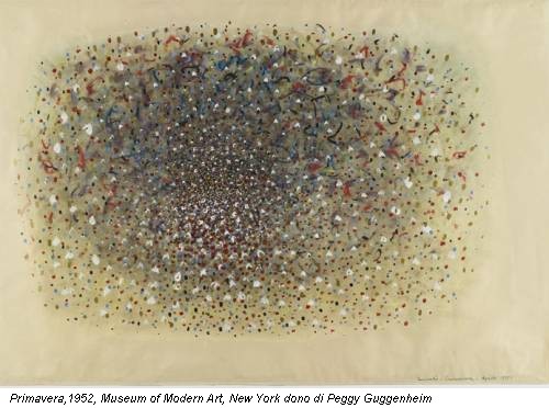 Una scelta d’allestimento che costituisce un chiaro parallelo con la figura di Carlo Rizzarda e la sua casa-museo e che sottolinea il binomio vita-arte al quale Tancredi soccomberà, incapace di trovare il giusto equilibrio. La biografia diventa quindi parte inscindibile della sua evoluzione artistica e linea portante del percorso espositivo. Dai primi successi segnati dalla personale allo studio Sandri, testimoniati da alcune opere del periodo definito concreto neoplastico, all’incontro con Peggy Guggenheim che lo porterà all’attenzione dei collezionisti americani, la mostra rende chiara la ricerca che lo condurrà al cosiddetto “Spazialismo” tancrediano a cui approda negli anni Cinquanta. Ben rappresentato è questo decennio che non a caso segna la consacrazione internazionale con la partecipazione alla mostra “Tendances Actuelles” della Kunsthalle di Berna (1955). La sala che accoglie il ciclo A proposito di Venezia avvolge lo spettatore con un turbinio di colori perfettamente bilanciati che lasciano di stucco come la presenza nel soffitto dell’affresco, riportato su tela, intitolato La Colomba (1958).