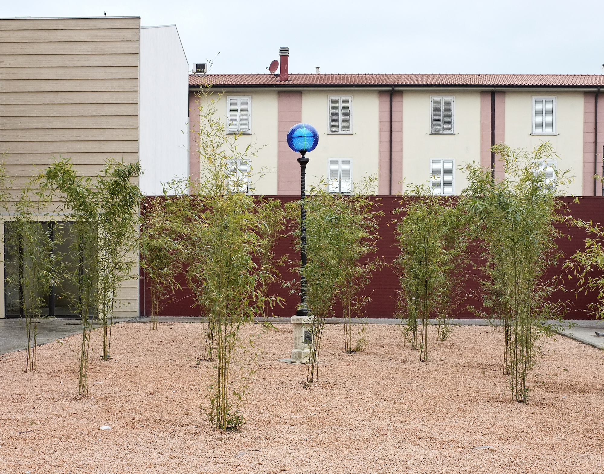 L’installazione All’imbrunire si presenta come un giovane bosco di bambù – una pianta sempreverde e resistente, capace di donare grandi quantità di ossigeno grazie alla sua efficiente abilità di fotosintesi – che si raccoglie come una scultura vegetale tra gli edifici museali. Un bosco le cui radici sono destinate a radicarsi come una comunità, le cui canne potranno innalzarsi a cielo aperto sino a dieci metri d’altezza, intersecandosi, relazionandosi, confondendosi, fino a formare un luogo intimo, il cui centro è immaginato per ospitare un cuore di luce. All’Imbrunire vede infatti la presenza di un candelabro, un lampione originale destinato sino a poco tempo prima ad essere dismesso, proveniente dalla suggestiva Terrazza Mascagni, il belvedere livornese che, con la sua elegante balaustra, si affaccia sul mar Tirreno. Il candelabro, di matrice liberty, ripristinato e rielaborato dall’artista attraverso la realizzazione di un globo colorato, che incornicia la sfera primigenia alla sommità, si accende ogni giorno al tramonto, “sul far della sera”, nel tempo dell’imbrunire. Un’opera che si attiva insieme all’illuminazione pubblica quando il museo sta per concludere le sue attività quotidiane, illuminando il vicino bistrot e i suoi giovani bevitori abituali che, dal 6 aprile 2019, sono i testimoni più speciali della crescita e dell’innalzamento progressivo del nuovo edificio vegetale, al chiaro di una luna vicina, la cima del candelabro ripristinato a nuova vita, dalle sfumature verdi-turchine che evocano i colori del mare. Un’opera che si offre anche durante il giorno attraverso la luce naturale, in un procedere crescente scandito dal ritmo del vento e dal passaggio di visitatori e cittadini, a cui il lavoro è dedicato.