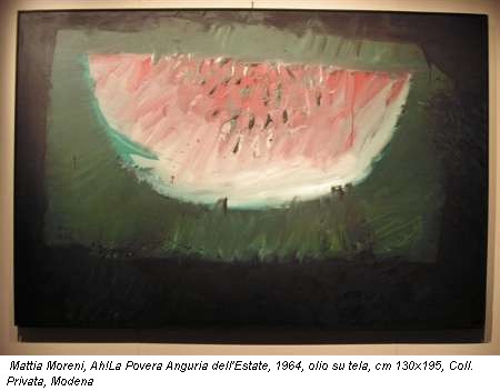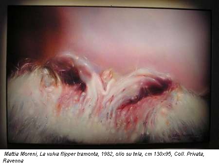La serie di Angurie scuoiate, aperte, inermi, pronte ad essere mangiate, sono una chiara allusione al frutto della terra, ma anche alla donna e al suo sesso. Dopo la vagina dipinta in modo impeccabile da Courbet nel 1866, Moreni porta alla Biennale di Venezia del ’52 lo stesso soggetto, ripetuto più volte nelle sue opere come motivo centrale. Non c’è scandalo nei salotti della Biennale per i suoi dipinti, che hanno l’alibi del voyeurismo, ed essendo sfocati e allusivi, inducono ad immaginare soggettivamente l’oggetto del desiderio. In La vulva flipper tramonta(1982), l’organo femminile sboccia come una rosa al mattino bagnata di rugiada. Il motivo dei genitali rafforza in lui a tendenza ribelle di delegittimare ogni tabù sociale.
